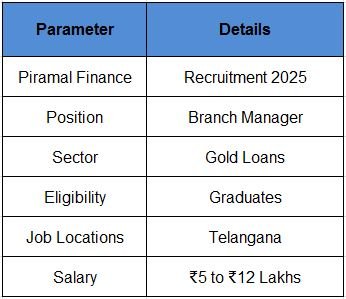 Piramal Finance Recruitment 2025 | Branch Manager-Gold Loans | Udyoga Varadhi
